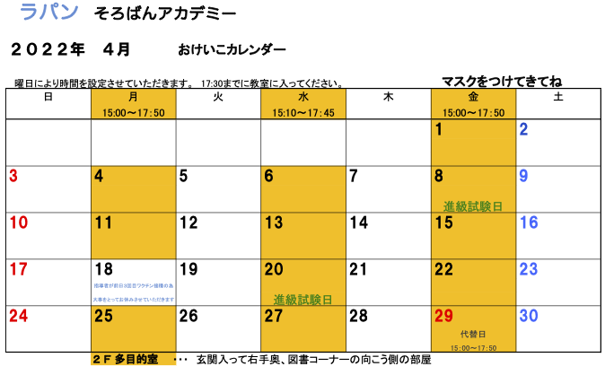 2022.03.29 4月のおけいこカレンダー 春休みも中盤に差し掛かり、4月からは新○年生ですね!進級おめでとうございます。 ラパンのお教室から見えるソメイヨシノの桜も満開をむかえています。 4月は出会いの季節。新しいお友達と目標をもって切磋琢磨しよう! 3月のおけいこカレンダー 5月のおけいこカレンダー