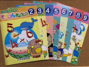 テキストは日本珠算連盟教育研究部会編集による『ソロピカはかせのそろばんきょうしつ』を使用します。このテキストはA4サイズのカラー刷りで小学校1年生の教科書に準じた構成になっており、全部で9冊(うちNo.1は体験学習で終了できるので実質No.2〜9)です。副教材の百玉そろばん、カラーそろばん、おはじきマグネットを使い、数を目で認識しながらより分かりやすく導いていきます。